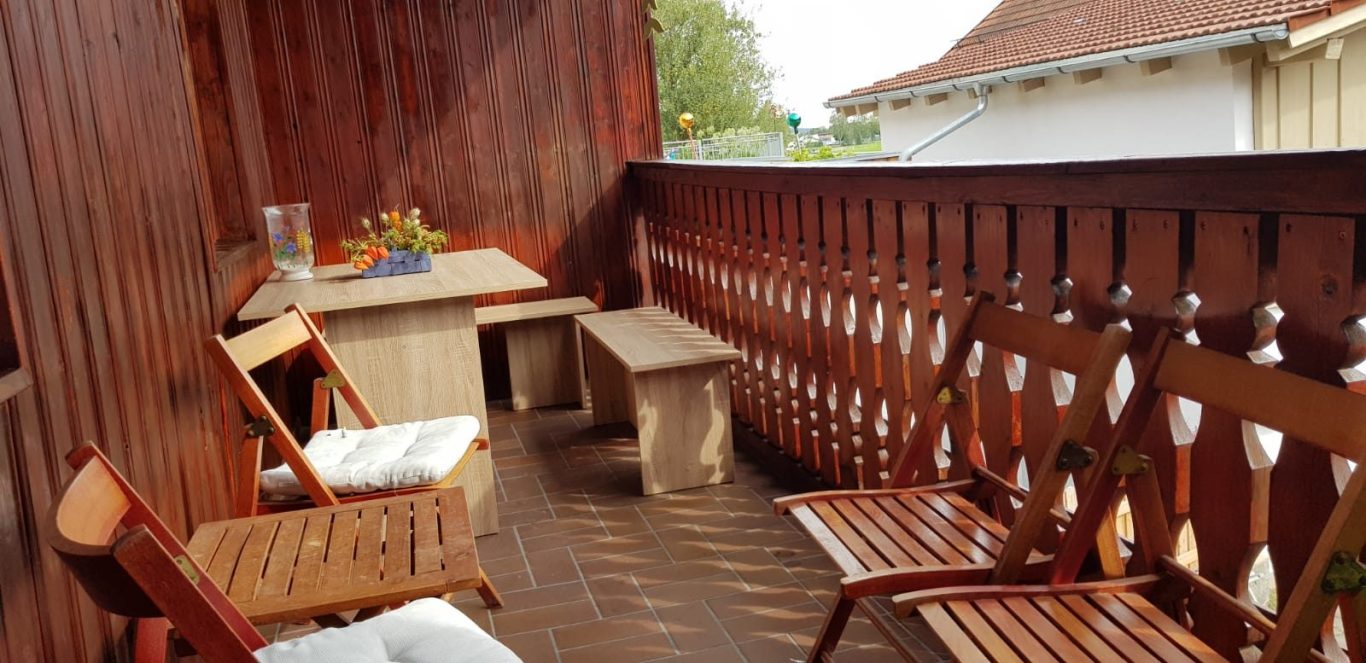 Ein Holztisch mit zwei Sitzbänken und zusätzlichen Klappstühlen stehen auf dem Balkon zur Verfügung.